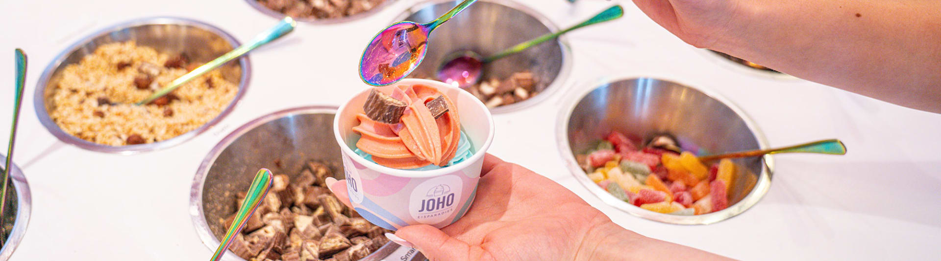 Im JOHO Eisparadies dreht sich alles um den eiskalten Softeis-Genuss. Unser modernes Konzept setzt auf einen weitgehenden Self-Service-Ansatz: Gäste wählen ihre Lieblingssorte, kombinieren sie mit Toppings nach Wahl und kreieren so ihr ganz persönliches Eis-Highlight. Abgerundet wird das Eis-Erlebnis durch unsere einzigartigen Bubble Waffeln - außen knusprig, innen himmlisch lecker.